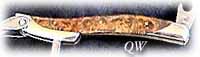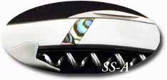 ステンレスのハンドル材の両面にアバロン(アワビの貝殻の内側)をワンポイントインレイしてあります。SS-Sはシンプルなオールステンレスハンドルです。